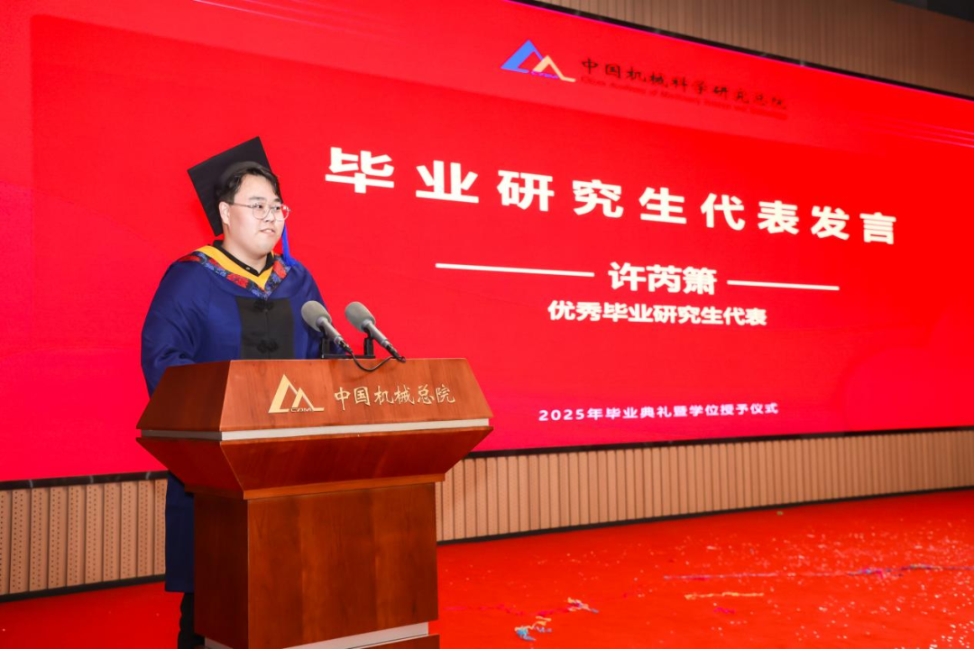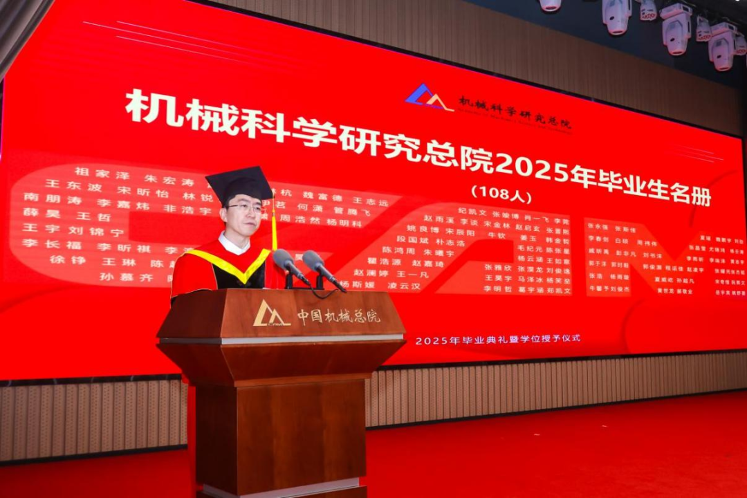 機(jī)械總院學(xué)位評定委員會主席、集團(tuán)黨委書記、董事長王德成,集團(tuán)黨委副書記、總經(jīng)理孟祥宇,集團(tuán)黨委副書記、董事李玉鑫,集團(tuán)黨委委員、副總經(jīng)理王宇,機(jī)械總院學(xué)位評定委員會副主席、集團(tuán)副總經(jīng)理李愛國,集團(tuán)副總經(jīng)理姜超出席典禮,機(jī)械總院學(xué)位評定委員會委員、京內(nèi)外各二級單位領(lǐng)導(dǎo)、導(dǎo)師代表、研究生管理部門負(fù)責(zé)人、2025屆畢業(yè)生及家屬共計190余人齊聚一堂,共同見證這一重要時刻。典禮由機(jī)械總院學(xué)位評定委員會秘書長、研究生院副院長邊翊主持。
