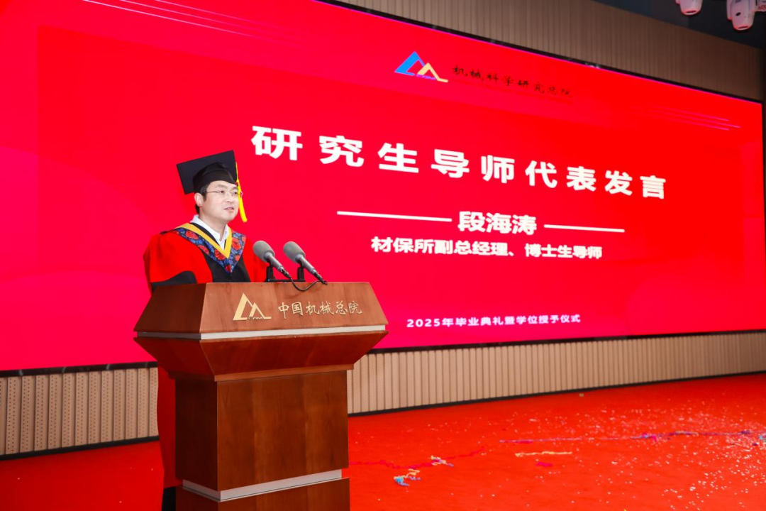 材保所副總經(jīng)理、博士生導(dǎo)師段海濤作為導(dǎo)師代表發(fā)言,為全體畢業(yè)生送上囑托和期望。他希望同學(xué)們樹立“大志向”、堅守“大擔(dān)當(dāng)”、秉持“大情懷”,用真才實學(xué)鐫刻屬于自己的璀璨印記。
